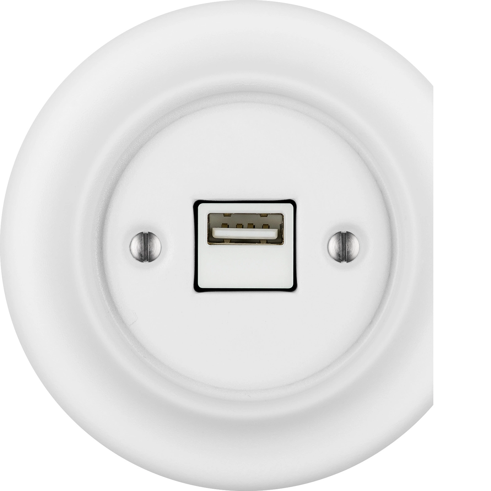 Porcelain USB charger. With glazed surface. Color - natural creamy white. With highly durable surface and color stability. CE conformity certificate. Decorative cover. Guarantee 50 years!